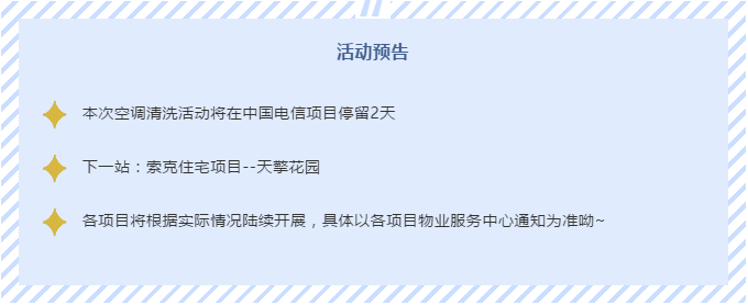 威廉希尔物业早早替业主们想到了这些隐患,除了往年部分项目会免费为业主们清洗房间内的空调外,今年还特意携手腾讯网·大豫养车项目为广大有车一族的业主们推出原价98元,威廉希尔业主福利价9.9元汽车空调管道清洗活动。