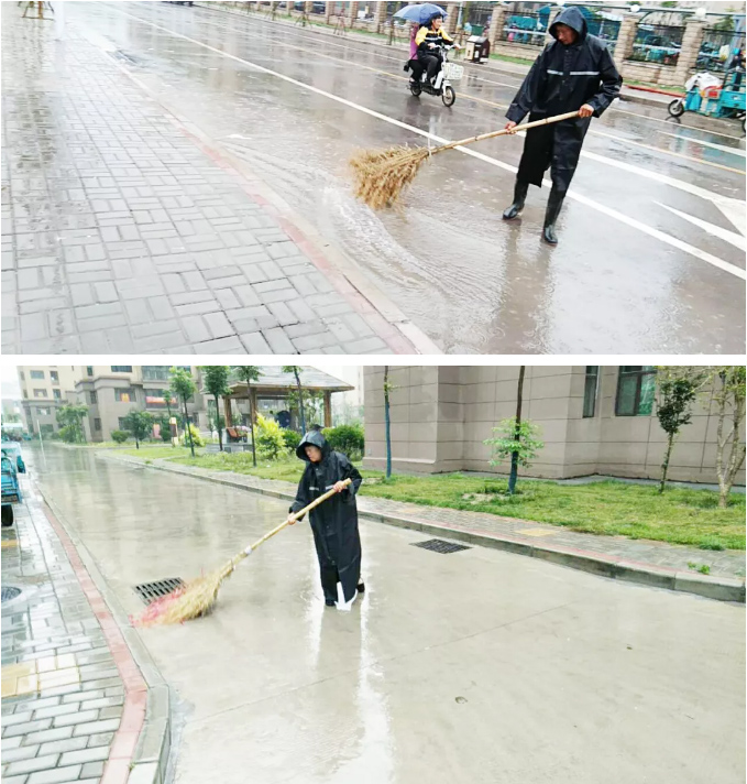 据了解,针对雨水天气,威廉希尔物业狼城岗项目专门制订了道路保洁预案,针对不同的雨情,采取不同的作业方式: