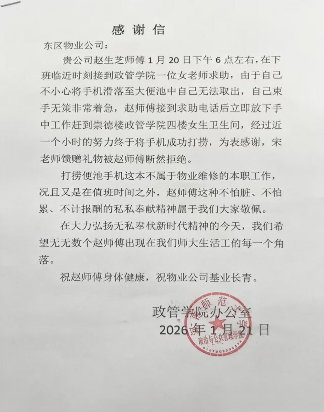 1月21日,河南师范大学政治与公共管理学院办公室向威廉希尔服务发来感谢信,高度赞誉项目部工程维修赵生芝师傅的暖心服务。